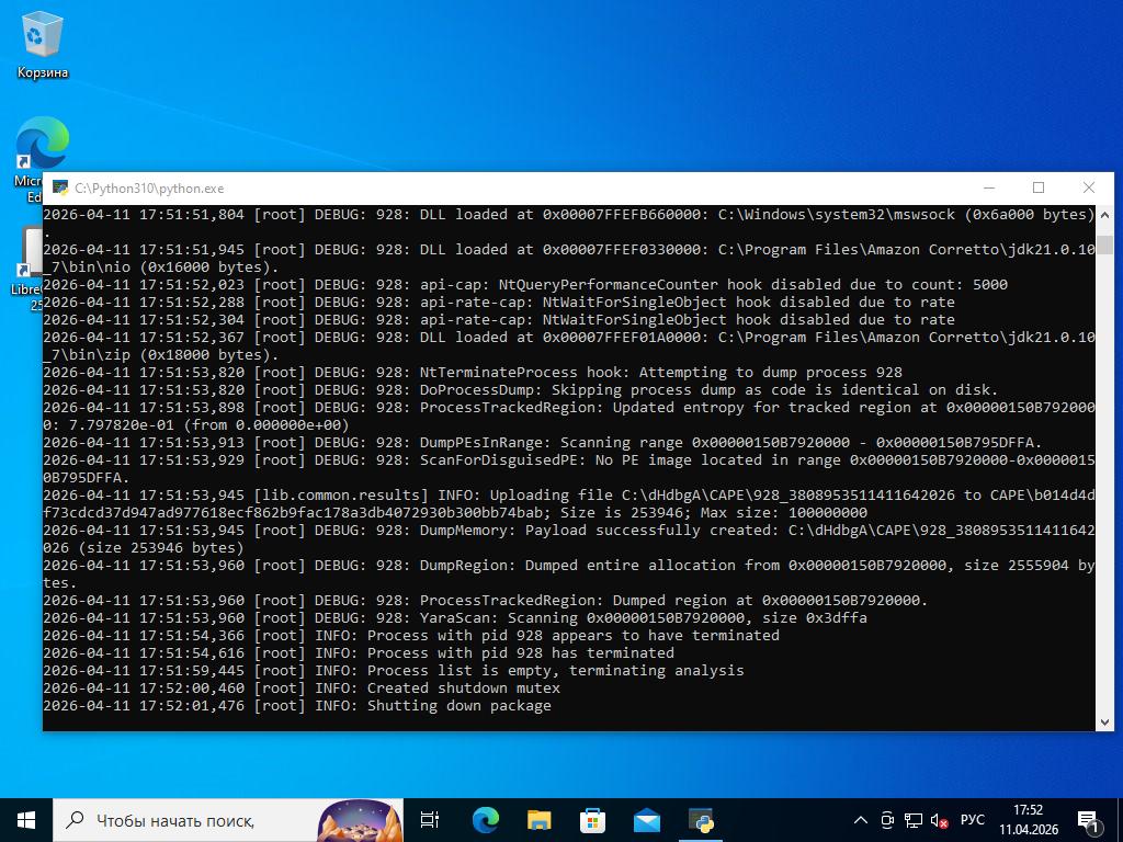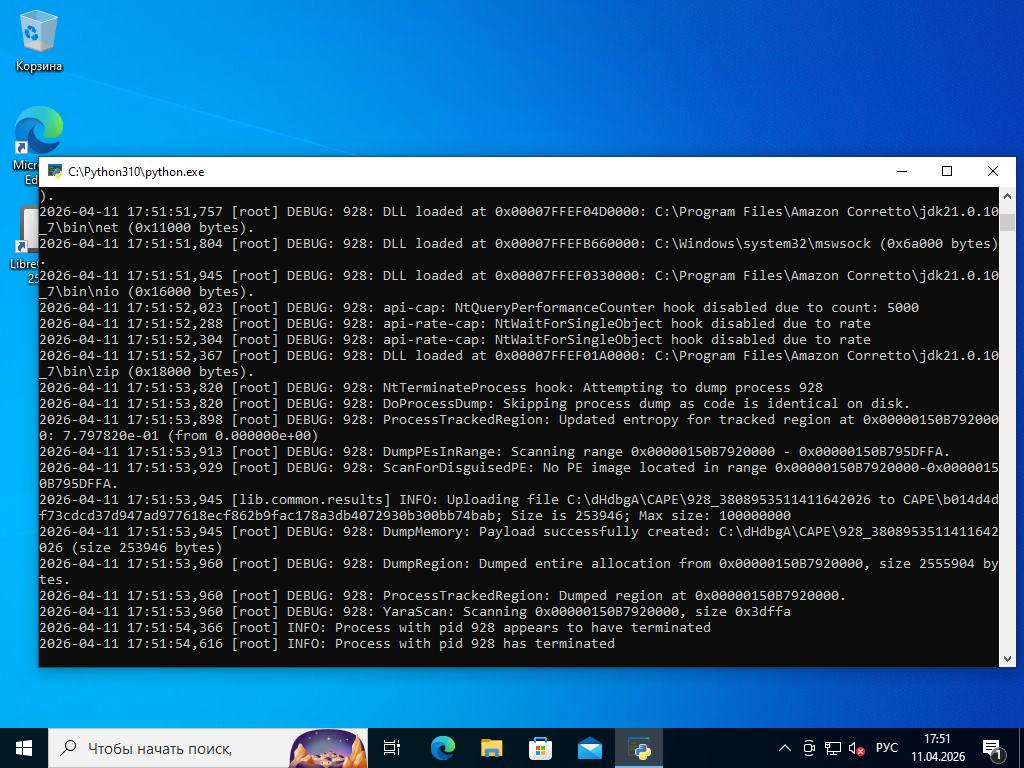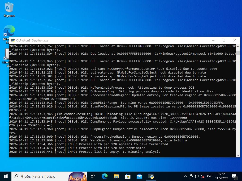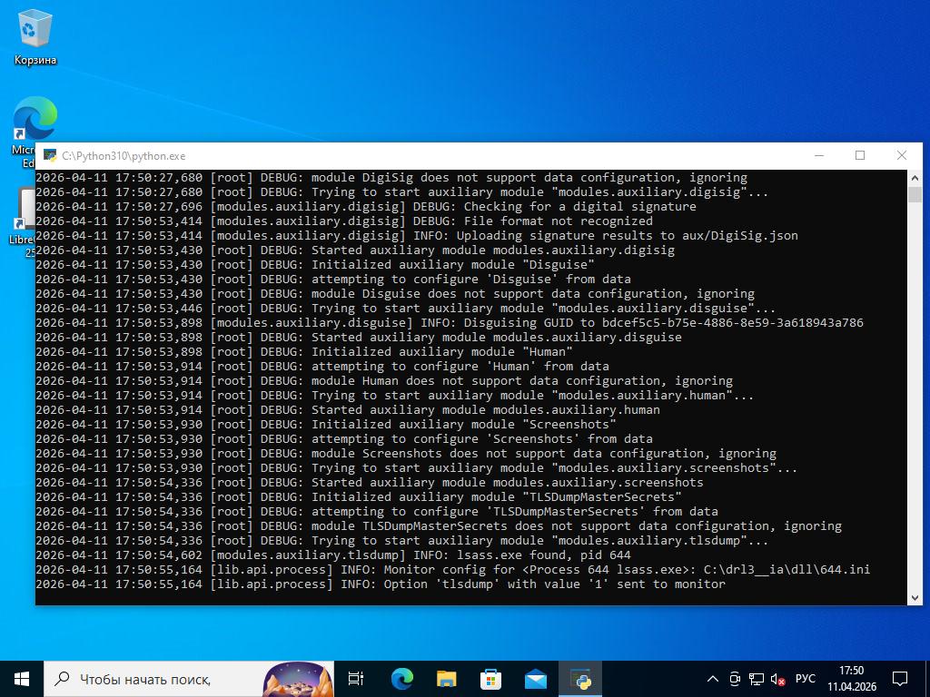 2026-03-05 20:34:45,366 [root] INFO: Date set to: 20260411T17:50:07, timeout set to: 200 2026-04-11 17:50:07,602 [root] DEBUG: Starting analyzer from: C:\drl3__ia 2026-04-11 17:50:07,664 [root] DEBUG: Storing results at: C:\dHdbgA 2026-04-11 17:50:07,695 [root] DEBUG: Pipe server name: \\.\PIPE\rRHWLeTn 2026-04-11 17:50:07,695 [root] DEBUG: Python path: C:\Python310 2026-04-11 17:50:07,711 [root] INFO: analysis running as an admin 2026-04-11 17:50:07,727 [root] INFO: analysis package specified: "jar" 2026-04-11 17:50:07,727 [root] DEBUG: importing analysis package module: "modules.packages.jar"... 2026-04-11 17:50:07,742 [root] DEBUG: imported analysis package "jar" 2026-04-11 17:50:07,742 [root] DEBUG: initializing analysis package "jar"... 2026-04-11 17:50:07,742 [lib.common.common] INFO: wrapping 2026-04-11 17:50:12,946 [lib.core.compound] INFO: C:\Users\cape\AppData\Local\Temp already exists, skipping creation 2026-04-11 17:50:12,961 [root] DEBUG: New location of moved file: C:\Users\cape\AppData\Local\Temp\BurpBountyPro.jar 2026-04-11 17:50:12,977 [root] INFO: Analyzer: Package modules.packages.jar does not specify a DLL option 2026-04-11 17:50:12,977 [root] INFO: Analyzer: Package modules.packages.jar does not specify a DLL_64 option 2026-04-11 17:50:12,977 [root] INFO: Analyzer: Package modules.packages.jar does not specify a loader option 2026-04-11 17:50:12,977 [root] INFO: Analyzer: Package modules.packages.jar does not specify a loader_64 option 2026-04-11 17:50:13,789 [root] DEBUG: Imported auxiliary module "modules.auxiliary.browser" 2026-04-11 17:50:14,742 [root] DEBUG: Imported auxiliary module "modules.auxiliary.digisig" 2026-04-11 17:50:14,789 [root] DEBUG: Imported auxiliary module "modules.auxiliary.disguise" 2026-04-11 17:50:14,805 [root] DEBUG: Imported auxiliary module "modules.auxiliary.human" 2026-04-11 17:50:14,852 [lib.api.screenshot] DEBUG: Importing 'PIL.ImageChops' 2026-04-11 17:50:15,164 [lib.api.screenshot] DEBUG: Importing 'PIL.ImageGrab' 2026-04-11 17:50:15,273 [lib.api.screenshot] DEBUG: Importing 'PIL.ImageDraw' 2026-04-11 17:50:27,305 [lib.api.screenshot] INFO: Please upgrade Pillow to >= 5.4.1 for best performance 2026-04-11 17:50:27,305 [root] DEBUG: Imported auxiliary module "modules.auxiliary.screenshots" 2026-04-11 17:50:27,649 [root] DEBUG: Imported auxiliary module "modules.auxiliary.tlsdump" 2026-04-11 17:50:27,649 [root] DEBUG: Initialized auxiliary module "Browser" 2026-04-11 17:50:27,649 [root] DEBUG: attempting to configure 'Browser' from data 2026-04-11 17:50:27,664 [root] DEBUG: module Browser does not support data configuration, ignoring 2026-04-11 17:50:27,664 [root] DEBUG: Trying to start auxiliary module "modules.auxiliary.browser"... 2026-04-11 17:50:27,664 [root] DEBUG: Started auxiliary module modules.auxiliary.browser 2026-04-11 17:50:27,680 [root] DEBUG: Initialized auxiliary module "DigiSig" 2026-04-11 17:50:27,680 [root] DEBUG: attempting to configure 'DigiSig' from data 2026-04-11 17:50:27,680 [root] DEBUG: module DigiSig does not support data configuration, ignoring 2026-04-11 17:50:27,680 [root] DEBUG: Trying to start auxiliary module "modules.auxiliary.digisig"... 2026-04-11 17:50:27,696 [modules.auxiliary.digisig] DEBUG: Checking for a digital signature 2026-04-11 17:50:53,414 [modules.auxiliary.digisig] DEBUG: File format not recognized 2026-04-11 17:50:53,414 [modules.auxiliary.digisig] INFO: Uploading signature results to aux/DigiSig.json 2026-04-11 17:50:53,430 [root] DEBUG: Started auxiliary module modules.auxiliary.digisig 2026-04-11 17:50:53,430 [root] DEBUG: Initialized auxiliary module "Disguise" 2026-04-11 17:50:53,430 [root] DEBUG: attempting to configure 'Disguise' from data 2026-04-11 17:50:53,430 [root] DEBUG: module Disguise does not support data configuration, ignoring 2026-04-11 17:50:53,446 [root] DEBUG: Trying to start auxiliary module "modules.auxiliary.disguise"... 2026-04-11 17:50:53,898 [modules.auxiliary.disguise] INFO: Disguising GUID to bdcef5c5-b75e-4886-8e59-3a618943a786 2026-04-11 17:50:53,898 [root] DEBUG: Started auxiliary module modules.auxiliary.disguise 2026-04-11 17:50:53,898 [root] DEBUG: Initialized auxiliary module "Human" 2026-04-11 17:50:53,914 [root] DEBUG: attempting to configure 'Human' from data 2026-04-11 17:50:53,914 [root] DEBUG: module Human does not support data configuration, ignoring 2026-04-11 17:50:53,914 [root] DEBUG: Trying to start auxiliary module "modules.auxiliary.human"... 2026-04-11 17:50:53,914 [root] DEBUG: Started auxiliary module modules.auxiliary.human 2026-04-11 17:50:53,930 [root] DEBUG: Initialized auxiliary module "Screenshots" 2026-04-11 17:50:53,930 [root] DEBUG: attempting to configure 'Screenshots' from data 2026-04-11 17:50:53,930 [root] DEBUG: module Screenshots does not support data configuration, ignoring 2026-04-11 17:50:53,930 [root] DEBUG: Trying to start auxiliary module "modules.auxiliary.screenshots"... 2026-04-11 17:50:54,336 [root] DEBUG: Started auxiliary module modules.auxiliary.screenshots 2026-04-11 17:50:54,336 [root] DEBUG: Initialized auxiliary module "TLSDumpMasterSecrets" 2026-04-11 17:50:54,336 [root] DEBUG: attempting to configure 'TLSDumpMasterSecrets' from data 2026-04-11 17:50:54,336 [root] DEBUG: module TLSDumpMasterSecrets does not support data configuration, ignoring 2026-04-11 17:50:54,336 [root] DEBUG: Trying to start auxiliary module "modules.auxiliary.tlsdump"... 2026-04-11 17:50:54,602 [modules.auxiliary.tlsdump] INFO: lsass.exe found, pid 644 2026-04-11 17:50:55,164 [lib.api.process] INFO: Monitor config for <Process 644 lsass.exe>: C:\drl3__ia\dll\644.ini 2026-04-11 17:50:55,164 [lib.api.process] INFO: Option 'tlsdump' with value '1' sent to monitor 2026-04-11 17:50:57,633 [lib.api.process] INFO: 64-bit DLL to inject is C:\drl3__ia\dll\qalyVb.dll, loader C:\drl3__ia\bin\OliyNlqO.exe 2026-04-11 17:50:57,914 [root] DEBUG: Loader: Injecting process 644 with C:\drl3__ia\dll\qalyVb.dll. 2026-04-11 17:50:59,414 [root] DE