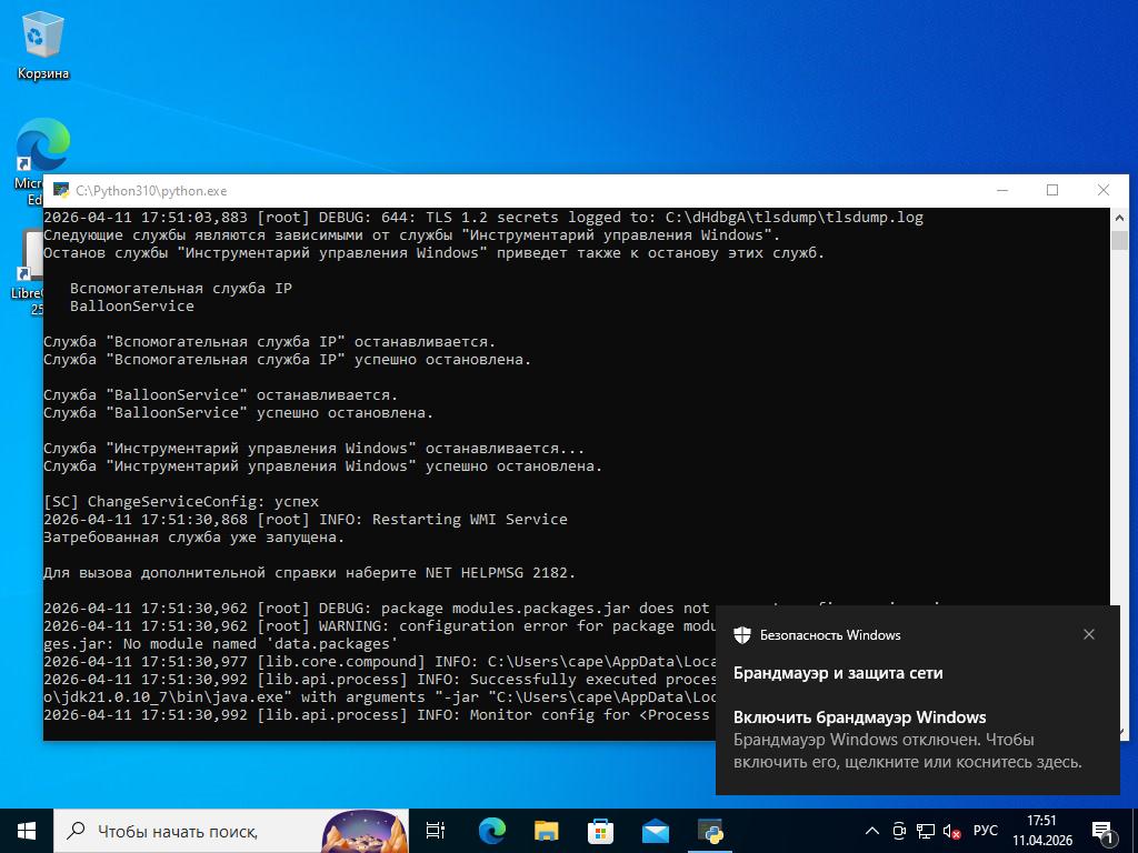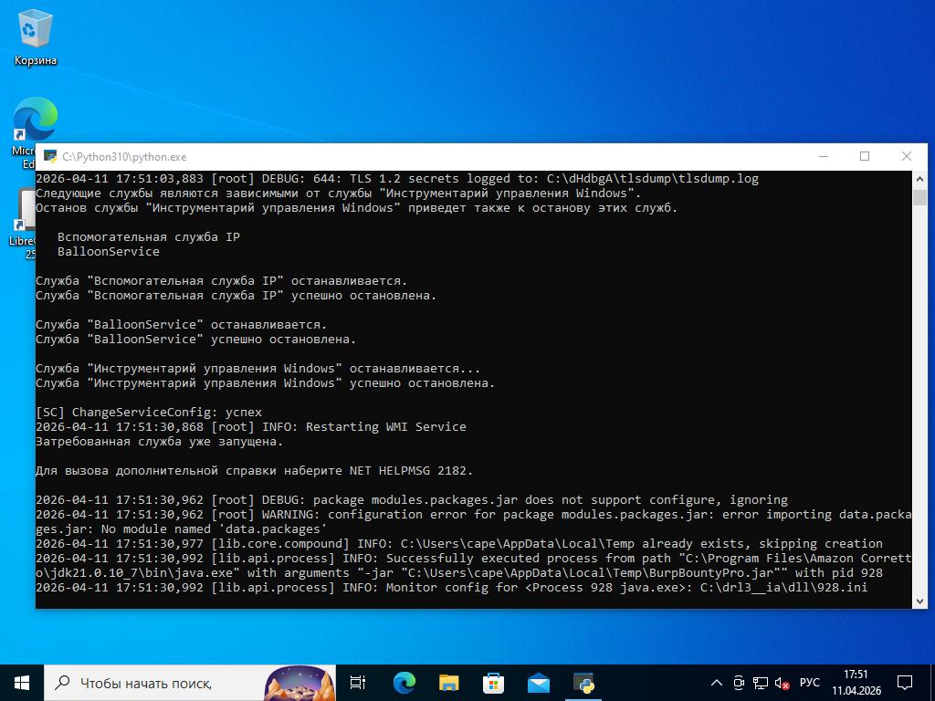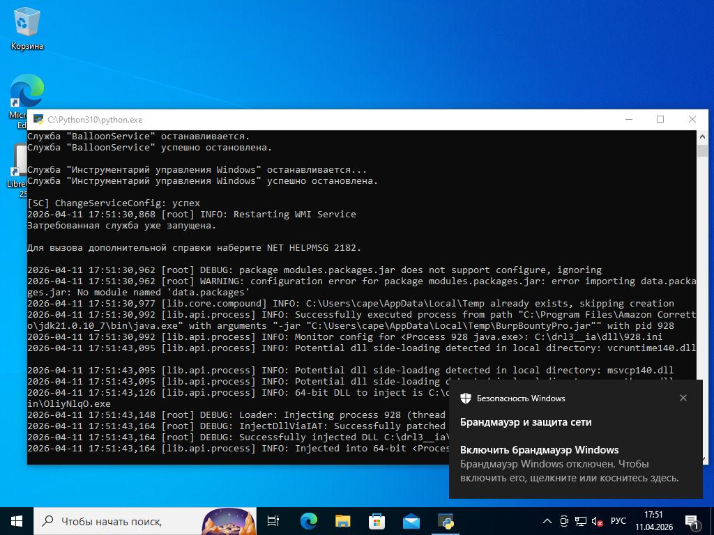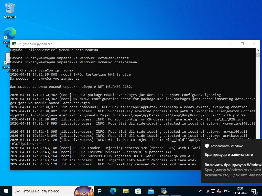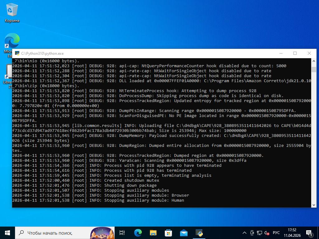 2026-03-05 20:34:45,366 [root] INFO: Date set to: 20260411T17:50:07, timeout set to: 200 2026-04-11 17:50:07,602 [root] DEBUG: Starting analyzer from: C:\drl3__ia 2026-04-11 17:50:07,664 [root] DEBUG: Storing results at: C:\dHdbgA 2026-04-11 17:50:07,695 [root] DEBUG: Pipe server name: \\.\PIPE\rRHWLeTn 2026-04-11 17:50:07,695 [root] DEBUG: Python path: C:\Python310 2026-04-11 17:50:07,711 [root] INFO: analysis running as an admin 2026-04-11 17:50:07,727 [root] INFO: analysis package specified: "jar" 2026-04-11 17:50:07,727 [root] DEBUG: importing analysis package module: "modules.packages.jar"... 2026-04-11 17:50:07,742 [root] DEBUG: imported analysis package "jar" 2026-04-11 17:50:07,742 [root] DEBUG: initializing analysis package "jar"... 2026-04-11 17:50:07,742 [lib.common.common] INFO: wrapping 2026-04-11 17:50:12,946 [lib.core.compound] INFO: C:\Users\cape\AppData\Local\Temp already exists, skipping creation 2026-04-11 17:50:12,961 [root] DEBUG: New location of moved file: C:\Users\cape\AppData\Local\Temp\BurpBountyPro.jar 2026-04-11 17:50:12,977 [root] INFO: Analyzer: Package modules.packages.jar does not specify a DLL option 2026-04-11 17:50:12,977 [root] INFO: Analyzer: Package modules.packages.jar does not specify a DLL_64 option 2026-04-11 17:50:12,977 [root] INFO: Analyzer: Package modules.packages.jar does not specify a loader option 2026-04-11 17:50:12,977 [root] INFO: Analyzer: Package modules.packages.jar does not specify a loader_64 option 2026-04-11 17:50:13,789 [root] DEBUG: Imported auxiliary module "modules.auxiliary.browser" 2026-04-11 17:50:14,742 [root] DEBUG: Imported auxiliary module "modules.auxiliary.digisig" 2026-04-11 17:50:14,789 [root] DEBUG: Imported auxiliary module "modules.auxiliary.disguise" 2026-04-11 17:50:14,805 [root] DEBUG: Imported auxiliary module "modules.auxiliary.human" 2026-04-11 17:50:14,852 [lib.api.screenshot] DEBUG: Importing 'PIL.ImageChops' 2026-04-11 17:50:15,164 [lib.api.screenshot] DEBUG: Importing 'PIL.ImageGrab' 2026-04-11 17:50:15,273 [lib.api.screenshot] DEBUG: Importing 'PIL.ImageDraw' 2026-04-11 17:50:27,305 [lib.api.screenshot] INFO: Please upgrade Pillow to >= 5.4.1 for best performance 2026-04-11 17:50:27,305 [root] DEBUG: Imported auxiliary module "modules.auxiliary.screenshots" 2026-04-11 17:50:27,649 [root] DEBUG: Imported auxiliary module "modules.auxiliary.tlsdump" 2026-04-11 17:50:27,649 [root] DEBUG: Initialized auxiliary module "Browser" 2026-04-11 17:50:27,649 [root] DEBUG: attempting to configure 'Browser' from data 2026-04-11 17:50:27,664 [root] DEBUG: module Browser does not support data configuration, ignoring 2026-04-11 17:50:27,664 [root] DEBUG: Trying to start auxiliary module "modules.auxiliary.browser"... 2026-04-11 17:50:27,664 [root] DEBUG: Started auxiliary module modules.auxiliary.browser 2026-04-11 17:50:27,680 [root] DEBUG: Initialized auxiliary module "DigiSig" 2026-04-11 17:50:27,680 [root] DEBUG: attempting to configure 'DigiSig' from data 2026-04-11 17:50:27,680 [root] DEBUG: module DigiSig does not support data configuration, ignoring 2026-04-11 17:50:27,680 [root] DEBUG: Trying to start auxiliary module "modules.auxiliary.digisig"... 2026-04-11 17:50:27,696 [modules.auxiliary.digisig] DEBUG: Checking for a digital signature 2026-04-11 17:50:53,414 [modules.auxiliary.digisig] DEBUG: File format not recognized 2026-04-11 17:50:53,414 [modules.auxiliary.digisig] INFO: Uploading signature results to aux/DigiSig.json 2026-04-11 17:50:53,430 [root] DEBUG: Started auxiliary module modules.auxiliary.digisig 2026-04-11 17:50:53,430 [root] DEBUG: Initialized auxiliary module "Disguise" 2026-04-11 17:50:53,430 [root] DEBUG: attempting to configure 'Disguise' from data 2026-04-11 17:50:53,430 [root] DEBUG: module Disguise does not support data configuration, ignoring 2026-04-11 17:50:53,446 [root] DEBUG: Trying to start auxiliary module "modules.auxiliary.disguise"... 2026-04-11 17:50:53,898 [modules.auxiliary.disguise] INFO: Disguising GUID to bdcef5c5-b75e-4886-8e59-3a618943a786 2026-04-11 17:50:53,898 [root] DEBUG: Started auxiliary module modules.auxiliary.disguise 2026-04-11 17:50:53,898 [root] DEBUG: Initialized auxiliary module "Human" 2026-04-11 17:50:53,914 [root] DEBUG: attempting to configure 'Human' from data 2026-04-11 17:50:53,914 [root] DEBUG: module Human does not support data configuration, ignoring 2026-04-11 17:50:53,914 [root] DEBUG: Trying to start auxiliary module "modules.auxiliary.human"... 2026-04-11 17:50:53,914 [root] DEBUG: Started auxiliary module modules.auxiliary.human 2026-04-11 17:50:53,930 [root] DEBUG: Initialized auxiliary module "Screenshots" 2026-04-11 17:50:53,930 [root] DEBUG: attempting to configure 'Screenshots' from data 2026-04-11 17:50:53,930 [root] DEBUG: module Screenshots does not support data configuration, ignoring 2026-04-11 17:50:53,930 [root] DEBUG: Trying to start auxiliary module "modules.auxiliary.screenshots"... 2026-04-11 17:50:54,336 [root] DEBUG: Started auxiliary module modules.auxiliary.screenshots 2026-04-11 17:50:54,336 [root] DEBUG: Initialized auxiliary module "TLSDumpMasterSecrets" 2026-04-11 17:50:54,336 [root] DEBUG: attempting to configure 'TLSDumpMasterSecrets' from data 2026-04-11 17:50:54,336 [root] DEBUG: module TLSDumpMasterSecrets does not support data configuration, ignoring 2026-04-11 17:50:54,336 [root] DEBUG: Trying to start auxiliary module "modules.auxiliary.tlsdump"... 2026-04-11 17:50:54,602 [modules.auxiliary.tlsdump] INFO: lsass.exe found, pid 644 2026-04-11 17:50:55,164 [lib.api.process] INFO: Monitor config for <Process 644 lsass.exe>: C:\drl3__ia\dll\644.ini 2026-04-11 17:50:55,164 [lib.api.process] INFO: Option 'tlsdump' with value '1' sent to monitor 2026-04-11 17:50:57,633 [lib.api.process] INFO: 64-bit DLL to inject is C:\drl3__ia\dll\qalyVb.dll, loader C:\drl3__ia\bin\OliyNlqO.exe 2026-04-11 17:50:57,914 [root] DEBUG: Loader: Injecting process 644 with C:\drl3__ia\dll\qalyVb.dll. 2026-04-11 17:50:59,414 [root] DE
