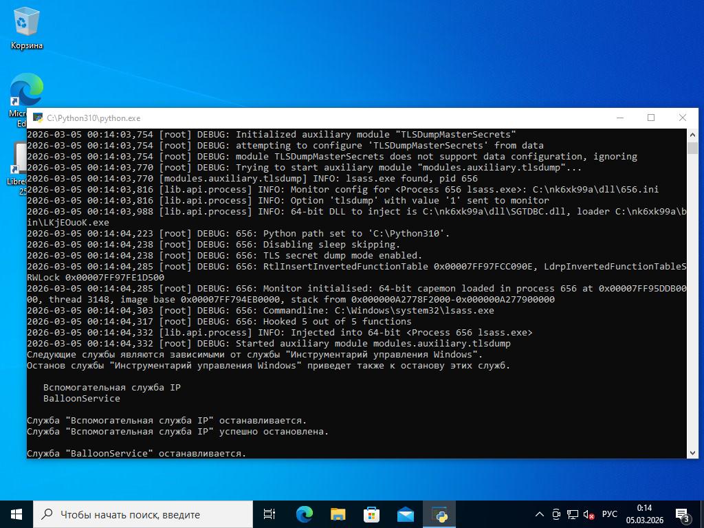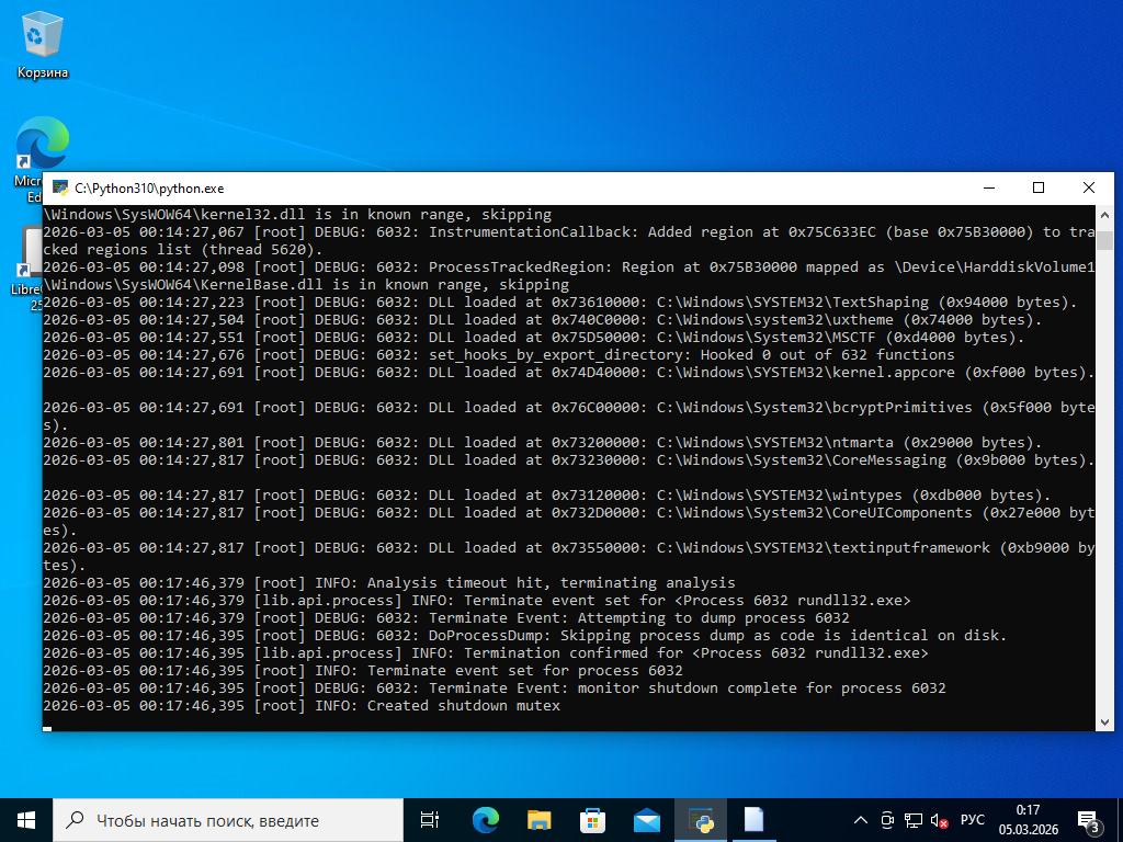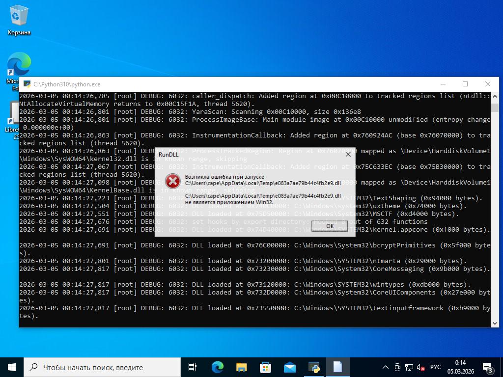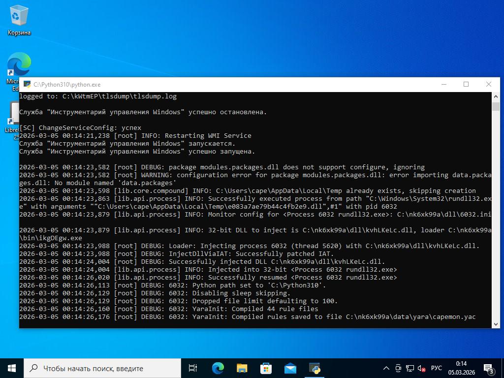 2026-03-05 02:28:20,371 [root] INFO: Date set to: 20260305T00:14:02, timeout set to: 200 2026-03-05 00:14:02,051 [root] DEBUG: Starting analyzer from: C:\nk6xk99a 2026-03-05 00:14:02,051 [root] DEBUG: Storing results at: C:\kWtmEP 2026-03-05 00:14:02,051 [root] DEBUG: Pipe server name: \\.\PIPE\nIfCthB 2026-03-05 00:14:02,051 [root] DEBUG: Python path: C:\Python310 2026-03-05 00:14:02,051 [root] INFO: analysis running as an admin 2026-03-05 00:14:02,051 [root] DEBUG: no analysis package configured, picking one for you 2026-03-05 00:14:02,051 [root] INFO: analysis package selected: "dll" 2026-03-05 00:14:02,051 [root] DEBUG: importing analysis package module: "modules.packages.dll"... 2026-03-05 00:14:02,098 [root] DEBUG: imported analysis package "dll" 2026-03-05 00:14:02,098 [root] DEBUG: initializing analysis package "dll"... 2026-03-05 00:14:02,098 [lib.common.common] INFO: wrapping 2026-03-05 00:14:02,160 [lib.core.compound] INFO: C:\Users\cape\AppData\Local\Temp already exists, skipping creation 2026-03-05 00:14:02,160 [root] DEBUG: New location of moved file: C:\Users\cape\AppData\Local\Temp\e083a7ae79b44c4fb2e9.dll 2026-03-05 00:14:02,160 [root] INFO: Analyzer: Package modules.packages.dll does not specify a DLL option 2026-03-05 00:14:02,160 [root] INFO: Analyzer: Package modules.packages.dll does not specify a DLL_64 option 2026-03-05 00:14:02,160 [root] INFO: Analyzer: Package modules.packages.dll does not specify a loader option 2026-03-05 00:14:02,160 [root] INFO: Analyzer: Package modules.packages.dll does not specify a loader_64 option 2026-03-05 00:14:02,285 [root] DEBUG: Imported auxiliary module "modules.auxiliary.browser" 2026-03-05 00:14:02,379 [root] DEBUG: Imported auxiliary module "modules.auxiliary.digisig" 2026-03-05 00:14:02,426 [root] DEBUG: Imported auxiliary module "modules.auxiliary.disguise" 2026-03-05 00:14:02,504 [root] DEBUG: Imported auxiliary module "modules.auxiliary.human" 2026-03-05 00:14:02,754 [lib.api.screenshot] DEBUG: Importing 'PIL.ImageChops' 2026-03-05 00:14:02,801 [lib.api.screenshot] DEBUG: Importing 'PIL.ImageGrab' 2026-03-05 00:14:02,801 [lib.api.screenshot] DEBUG: Importing 'PIL.ImageDraw' 2026-03-05 00:14:02,942 [lib.api.screenshot] INFO: Please upgrade Pillow to >= 5.4.1 for best performance 2026-03-05 00:14:02,942 [root] DEBUG: Imported auxiliary module "modules.auxiliary.screenshots" 2026-03-05 00:14:03,082 [root] DEBUG: Imported auxiliary module "modules.auxiliary.tlsdump" 2026-03-05 00:14:03,082 [root] DEBUG: Initialized auxiliary module "Browser" 2026-03-05 00:14:03,082 [root] DEBUG: attempting to configure 'Browser' from data 2026-03-05 00:14:03,082 [root] DEBUG: module Browser does not support data configuration, ignoring 2026-03-05 00:14:03,082 [root] DEBUG: Trying to start auxiliary module "modules.auxiliary.browser"... 2026-03-05 00:14:03,098 [root] DEBUG: Started auxiliary module modules.auxiliary.browser 2026-03-05 00:14:03,098 [root] DEBUG: Initialized auxiliary module "DigiSig" 2026-03-05 00:14:03,098 [root] DEBUG: attempting to configure 'DigiSig' from data 2026-03-05 00:14:03,098 [root] DEBUG: module DigiSig does not support data configuration, ignoring 2026-03-05 00:14:03,098 [root] DEBUG: Trying to start auxiliary module "modules.auxiliary.digisig"... 2026-03-05 00:14:03,098 [modules.auxiliary.digisig] DEBUG: Checking for a digital signature 2026-03-05 00:14:03,676 [modules.auxiliary.digisig] DEBUG: File format not recognized 2026-03-05 00:14:03,676 [modules.auxiliary.digisig] INFO: Uploading signature results to aux/DigiSig.json 2026-03-05 00:14:03,692 [root] DEBUG: Started auxiliary module modules.auxiliary.digisig 2026-03-05 00:14:03,692 [root] DEBUG: Initialized auxiliary module "Disguise" 2026-03-05 00:14:03,692 [root] DEBUG: attempting to configure 'Disguise' from data 2026-03-05 00:14:03,692 [root] DEBUG: module Disguise does not support data configuration, ignoring 2026-03-05 00:14:03,692 [root] DEBUG: Trying to start auxiliary module "modules.auxiliary.disguise"... 2026-03-05 00:14:03,723 [modules.auxiliary.disguise] INFO: Disguising GUID to ec24bf0b-09d7-4fe0-a551-9e044cf8910b 2026-03-05 00:14:03,723 [root] DEBUG: Started auxiliary module modules.auxiliary.disguise 2026-03-05 00:14:03,723 [root] DEBUG: Initialized auxiliary module "Human" 2026-03-05 00:14:03,738 [root] DEBUG: attempting to configure 'Human' from data 2026-03-05 00:14:03,738 [root] DEBUG: module Human does not support data configuration, ignoring 2026-03-05 00:14:03,738 [root] DEBUG: Trying to start auxiliary module "modules.auxiliary.human"... 2026-03-05 00:14:03,738 [root] DEBUG: Started auxiliary module modules.auxiliary.human 2026-03-05 00:14:03,738 [root] DEBUG: Initialized auxiliary module "Screenshots" 2026-03-05 00:14:03,738 [root] DEBUG: attempting to configure 'Screenshots' from data 2026-03-05 00:14:03,738 [root] DEBUG: module Screenshots does not support data configuration, ignoring 2026-03-05 00:14:03,738 [root] DEBUG: Trying to start auxiliary module "modules.auxiliary.screenshots"... 2026-03-05 00:14:03,754 [root] DEBUG: Started auxiliary module modules.auxiliary.screenshots 2026-03-05 00:14:03,754 [root] DEBUG: Initialized auxiliary module "TLSDumpMasterSecrets" 2026-03-05 00:14:03,754 [root] DEBUG: attempting to configure 'TLSDumpMasterSecrets' from data 2026-03-05 00:14:03,754 [root] DEBUG: module TLSDumpMasterSecrets does not support data configuration, ignoring 2026-03-05 00:14:03,770 [root] DEBUG: Trying to start auxiliary module "modules.auxiliary.tlsdump"... 2026-03-05 00:14:03,770 [modules.auxiliary.tlsdump] INFO: lsass.exe found, pid 656 2026-03-05 00:14:03,816 [lib.api.process] INFO: Monitor config for <Process 656 lsass.exe>: C:\nk6xk99a\dll\656.ini 2026-03-05 00:14:03,816 [lib.api.process] INFO: Option 'tlsdump' with value '1' sent to monitor 2026-03-05 00:14:03,988 [lib.api.process] INFO: 64-bit DLL to inject is C:\nk6xk99a\dll\SGTDBC.dll, loader C:\nk6xk99a\bin\LKjEOuoK.exe 2026-03-05 00:14:04,223 [root] DEBUG: 6