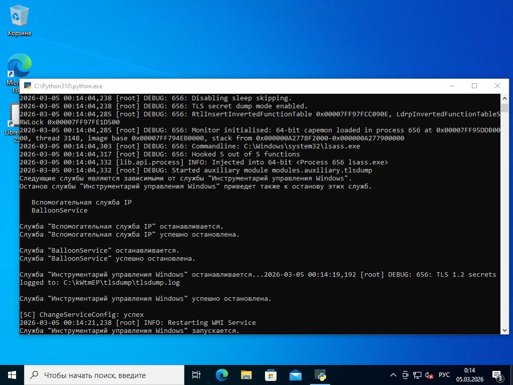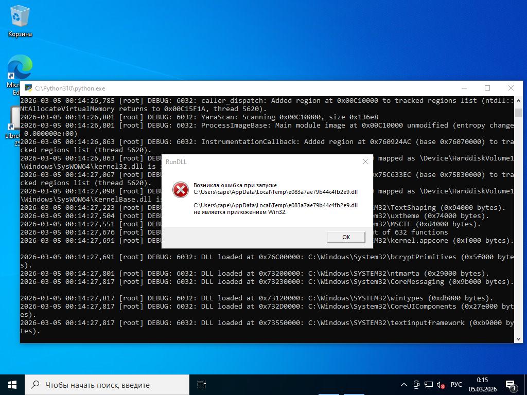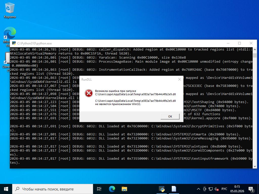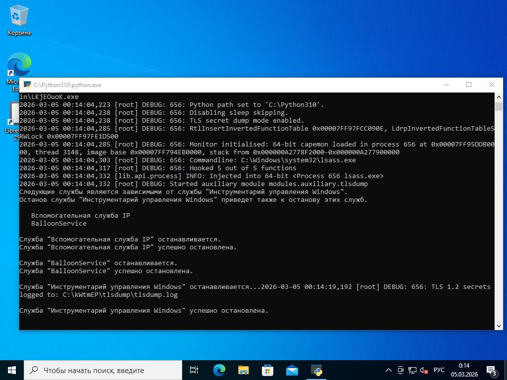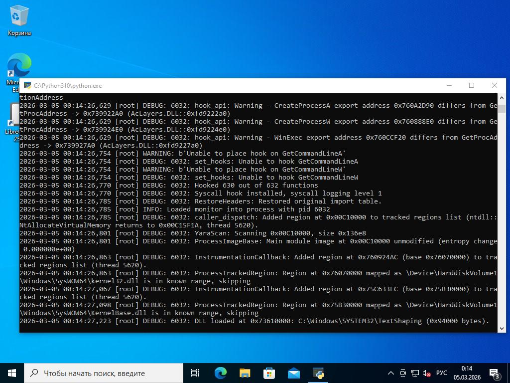 2026-03-05 02:28:20,371 [root] INFO: Date set to: 20260305T00:14:02, timeout set to: 200 2026-03-05 00:14:02,051 [root] DEBUG: Starting analyzer from: C:\nk6xk99a 2026-03-05 00:14:02,051 [root] DEBUG: Storing results at: C:\kWtmEP 2026-03-05 00:14:02,051 [root] DEBUG: Pipe server name: \\.\PIPE\nIfCthB 2026-03-05 00:14:02,051 [root] DEBUG: Python path: C:\Python310 2026-03-05 00:14:02,051 [root] INFO: analysis running as an admin 2026-03-05 00:14:02,051 [root] DEBUG: no analysis package configured, picking one for you 2026-03-05 00:14:02,051 [root] INFO: analysis package selected: "dll" 2026-03-05 00:14:02,051 [root] DEBUG: importing analysis package module: "modules.packages.dll"... 2026-03-05 00:14:02,098 [root] DEBUG: imported analysis package "dll" 2026-03-05 00:14:02,098 [root] DEBUG: initializing analysis package "dll"... 2026-03-05 00:14:02,098 [lib.common.common] INFO: wrapping 2026-03-05 00:14:02,160 [lib.core.compound] INFO: C:\Users\cape\AppData\Local\Temp already exists, skipping creation 2026-03-05 00:14:02,160 [root] DEBUG: New location of moved file: C:\Users\cape\AppData\Local\Temp\e083a7ae79b44c4fb2e9.dll 2026-03-05 00:14:02,160 [root] INFO: Analyzer: Package modules.packages.dll does not specify a DLL option 2026-03-05 00:14:02,160 [root] INFO: Analyzer: Package modules.packages.dll does not specify a DLL_64 option 2026-03-05 00:14:02,160 [root] INFO: Analyzer: Package modules.packages.dll does not specify a loader option 2026-03-05 00:14:02,160 [root] INFO: Analyzer: Package modules.packages.dll does not specify a loader_64 option 2026-03-05 00:14:02,285 [root] DEBUG: Imported auxiliary module "modules.auxiliary.browser" 2026-03-05 00:14:02,379 [root] DEBUG: Imported auxiliary module "modules.auxiliary.digisig" 2026-03-05 00:14:02,426 [root] DEBUG: Imported auxiliary module "modules.auxiliary.disguise" 2026-03-05 00:14:02,504 [root] DEBUG: Imported auxiliary module "modules.auxiliary.human" 2026-03-05 00:14:02,754 [lib.api.screenshot] DEBUG: Importing 'PIL.ImageChops' 2026-03-05 00:14:02,801 [lib.api.screenshot] DEBUG: Importing 'PIL.ImageGrab' 2026-03-05 00:14:02,801 [lib.api.screenshot] DEBUG: Importing 'PIL.ImageDraw' 2026-03-05 00:14:02,942 [lib.api.screenshot] INFO: Please upgrade Pillow to >= 5.4.1 for best performance 2026-03-05 00:14:02,942 [root] DEBUG: Imported auxiliary module "modules.auxiliary.screenshots" 2026-03-05 00:14:03,082 [root] DEBUG: Imported auxiliary module "modules.auxiliary.tlsdump" 2026-03-05 00:14:03,082 [root] DEBUG: Initialized auxiliary module "Browser" 2026-03-05 00:14:03,082 [root] DEBUG: attempting to configure 'Browser' from data 2026-03-05 00:14:03,082 [root] DEBUG: module Browser does not support data configuration, ignoring 2026-03-05 00:14:03,082 [root] DEBUG: Trying to start auxiliary module "modules.auxiliary.browser"... 2026-03-05 00:14:03,098 [root] DEBUG: Started auxiliary module modules.auxiliary.browser 2026-03-05 00:14:03,098 [root] DEBUG: Initialized auxiliary module "DigiSig" 2026-03-05 00:14:03,098 [root] DEBUG: attempting to configure 'DigiSig' from data 2026-03-05 00:14:03,098 [root] DEBUG: module DigiSig does not support data configuration, ignoring 2026-03-05 00:14:03,098 [root] DEBUG: Trying to start auxiliary module "modules.auxiliary.digisig"... 2026-03-05 00:14:03,098 [modules.auxiliary.digisig] DEBUG: Checking for a digital signature 2026-03-05 00:14:03,676 [modules.auxiliary.digisig] DEBUG: File format not recognized 2026-03-05 00:14:03,676 [modules.auxiliary.digisig] INFO: Uploading signature results to aux/DigiSig.json 2026-03-05 00:14:03,692 [root] DEBUG: Started auxiliary module modules.auxiliary.digisig 2026-03-05 00:14:03,692 [root] DEBUG: Initialized auxiliary module "Disguise" 2026-03-05 00:14:03,692 [root] DEBUG: attempting to configure 'Disguise' from data 2026-03-05 00:14:03,692 [root] DEBUG: module Disguise does not support data configuration, ignoring 2026-03-05 00:14:03,692 [root] DEBUG: Trying to start auxiliary module "modules.auxiliary.disguise"... 2026-03-05 00:14:03,723 [modules.auxiliary.disguise] INFO: Disguising GUID to ec24bf0b-09d7-4fe0-a551-9e044cf8910b 2026-03-05 00:14:03,723 [root] DEBUG: Started auxiliary module modules.auxiliary.disguise 2026-03-05 00:14:03,723 [root] DEBUG: Initialized auxiliary module "Human" 2026-03-05 00:14:03,738 [root] DEBUG: attempting to configure 'Human' from data 2026-03-05 00:14:03,738 [root] DEBUG: module Human does not support data configuration, ignoring 2026-03-05 00:14:03,738 [root] DEBUG: Trying to start auxiliary module "modules.auxiliary.human"... 2026-03-05 00:14:03,738 [root] DEBUG: Started auxiliary module modules.auxiliary.human 2026-03-05 00:14:03,738 [root] DEBUG: Initialized auxiliary module "Screenshots" 2026-03-05 00:14:03,738 [root] DEBUG: attempting to configure 'Screenshots' from data 2026-03-05 00:14:03,738 [root] DEBUG: module Screenshots does not support data configuration, ignoring 2026-03-05 00:14:03,738 [root] DEBUG: Trying to start auxiliary module "modules.auxiliary.screenshots"... 2026-03-05 00:14:03,754 [root] DEBUG: Started auxiliary module modules.auxiliary.screenshots 2026-03-05 00:14:03,754 [root] DEBUG: Initialized auxiliary module "TLSDumpMasterSecrets" 2026-03-05 00:14:03,754 [root] DEBUG: attempting to configure 'TLSDumpMasterSecrets' from data 2026-03-05 00:14:03,754 [root] DEBUG: module TLSDumpMasterSecrets does not support data configuration, ignoring 2026-03-05 00:14:03,770 [root] DEBUG: Trying to start auxiliary module "modules.auxiliary.tlsdump"... 2026-03-05 00:14:03,770 [modules.auxiliary.tlsdump] INFO: lsass.exe found, pid 656 2026-03-05 00:14:03,816 [lib.api.process] INFO: Monitor config for <Process 656 lsass.exe>: C:\nk6xk99a\dll\656.ini 2026-03-05 00:14:03,816 [lib.api.process] INFO: Option 'tlsdump' with value '1' sent to monitor 2026-03-05 00:14:03,988 [lib.api.process] INFO: 64-bit DLL to inject is C:\nk6xk99a\dll\SGTDBC.dll, loader C:\nk6xk99a\bin\LKjEOuoK.exe 2026-03-05 00:14:04,223 [root] DEBUG: 6